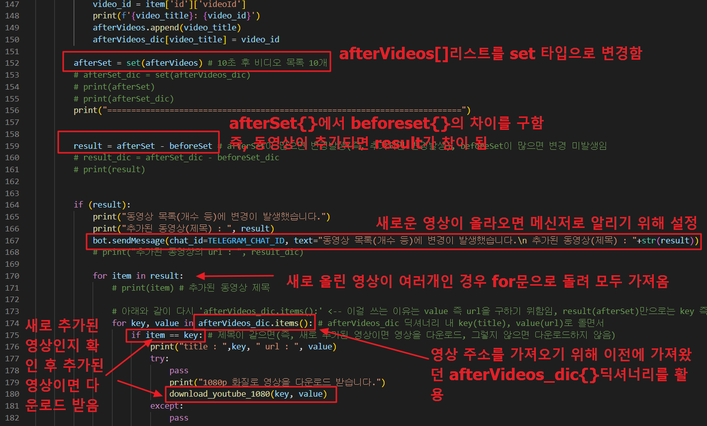 우리는 나중에 추가된 영상만 다운로드 할 것이기 때문에 '이후 영상목록'(afterVideos[])에서 '이전 영상목록'(beforeVideos[])의 차이를 구하기 위하여 beforeVideos[] 리스트를 set 타입으로 변환합니다.