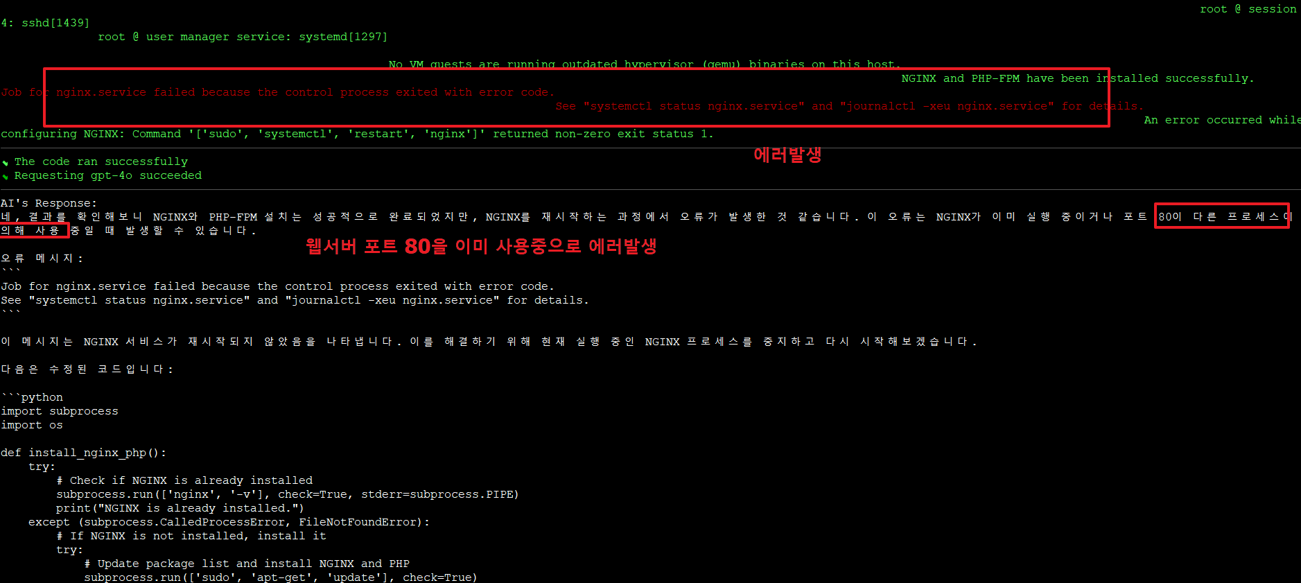 여기서는 chatGPT4o를 사용하여 질의/응답으로 웹서비스를 설치하는 방법과 오류발생 시 해결하는 방법 등을 살펴보겠습니다.