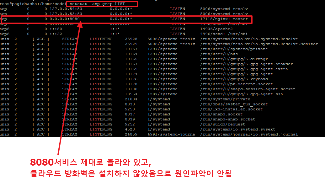 우리가 올린 웹서비스인 8080포트가 잘 올라와 있는 것을 볼 수 있습니다. 원인을 파악하기 어렵습니다.