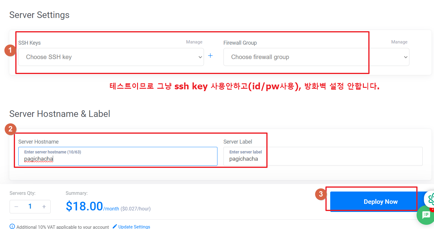 8. 우리는 테스트 목적이므로 별도 ssh key를 설정하지 않으며, 호스트네임을 넣고, "Deploy Now"를 클릭합니다.