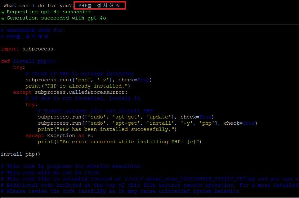 9. 이제 웹서버에서 보여줄 코드를 실행하기 위해서 PHP를 설치해 달라고 챗지피티옴니에게 요청하였습니다.